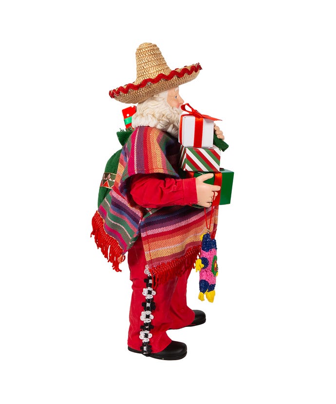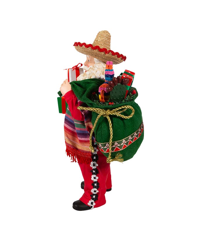 Part of Kurt Adler's Fabriché™ collection, this 11" Fabriché™ musical Mexican Santa is a festive addition to your holiday décor. Santa is featured wearing a sombrero and is carrying a green sack with a donkey piñata and gifts. In the other hand he is carrying a star piñata and an armful of decorated gifts. When switched on this piece plays the tune "Cielito Lindo."