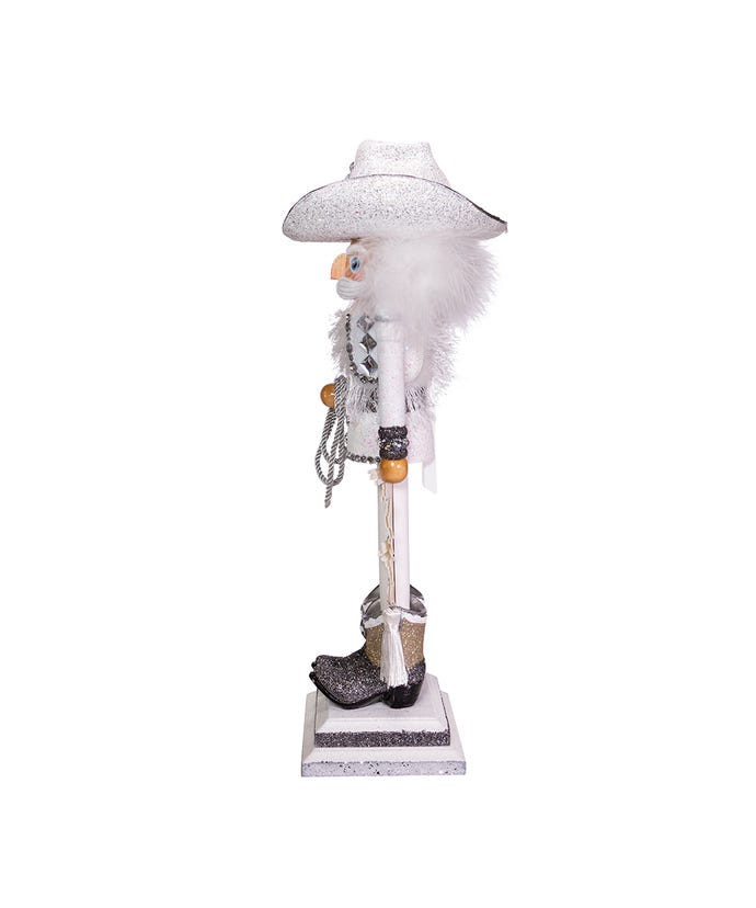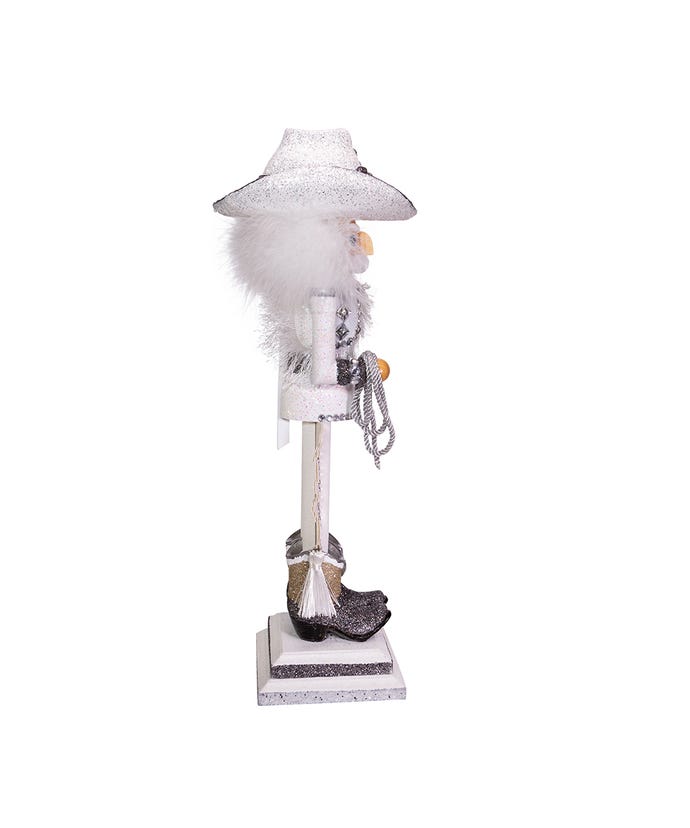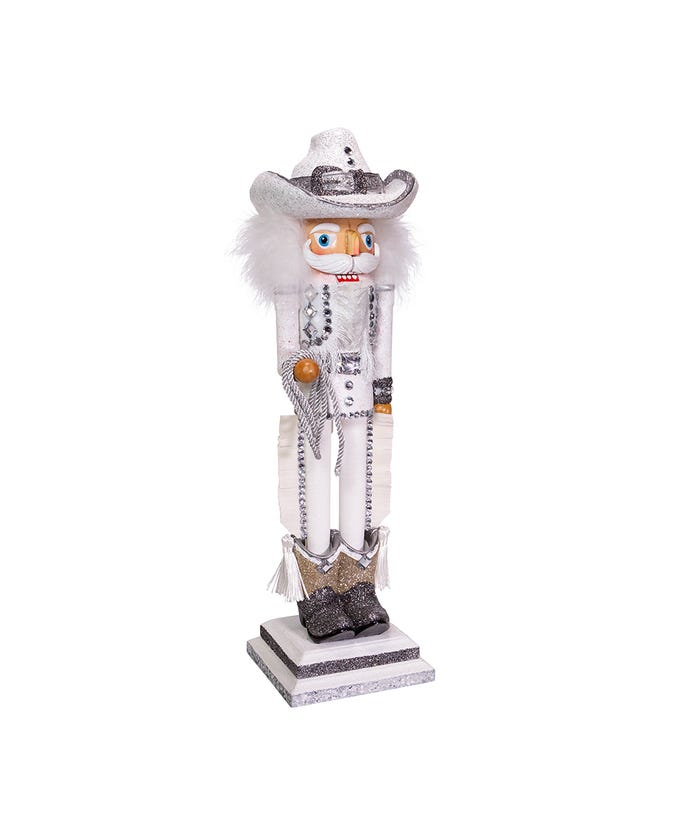 Hollywood Nutcrackers™ is a whimsical collection of nutcrackers created exclusively for Kurt S. Adler, Inc. and features an assortment of designs that put a unique, vibrant, memorable twist on traditional nutcrackers. This 19-inch Rhinestone Cowboy nutcracker features a cowboy in white and silver with a glittered cowboy hat and cowboy boots. He stands on a white and silver glittered base, has clear gemstone accents and is holding a silver lasso.