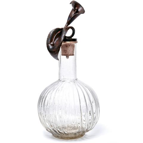 Large mouth blown fluted glass decanter with an artfully sculpted and forged iron calla lily