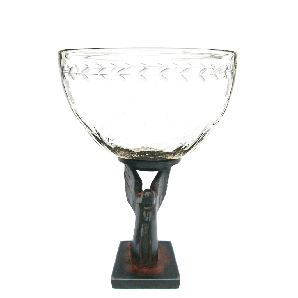 Mouth blown glass bowl w/ laurel etching held by a wax cast iron angel