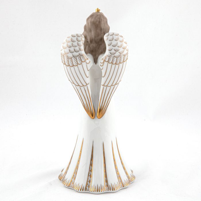 A subdued palette of gold and white creates an ethereal, quiet composition on this regal Angel with Dove. And yet, the folds of the skirt belie the stillness of the figurine by alluding to imminent movement and purpose as perhaps her arms reach to the heavens to release the dove.