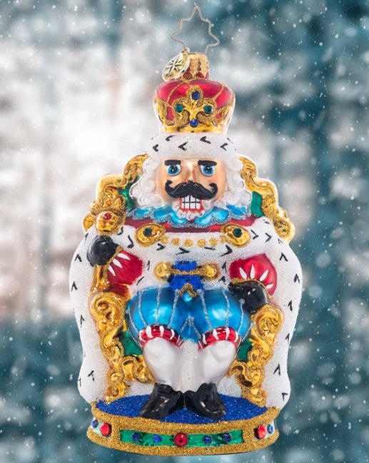 The nutcracker king is keeping court at the candy castle, sitting comfortably in a gilded throne. Add a regal touch to your tree with this stunning piece!