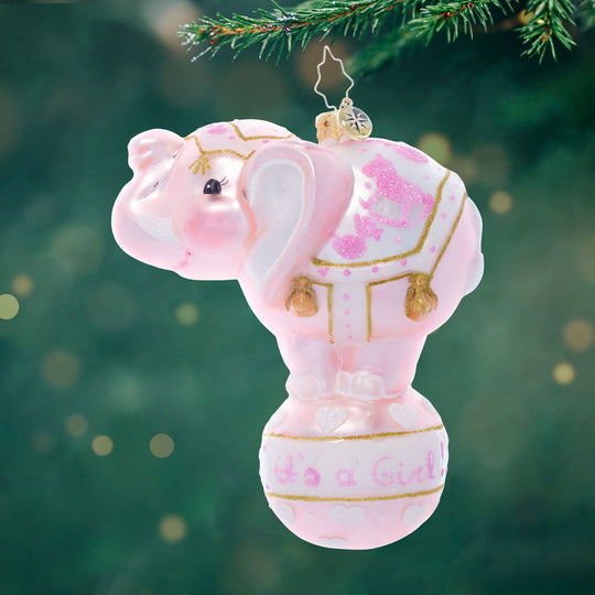 Celebrate your new arrival with this darling ornament featuring an adorable baby elephant, skillfully balancing on a pink ball, proudly announcing the arrival of a baby girl. It's a precious keepsake to commemorate the newest member of the family.