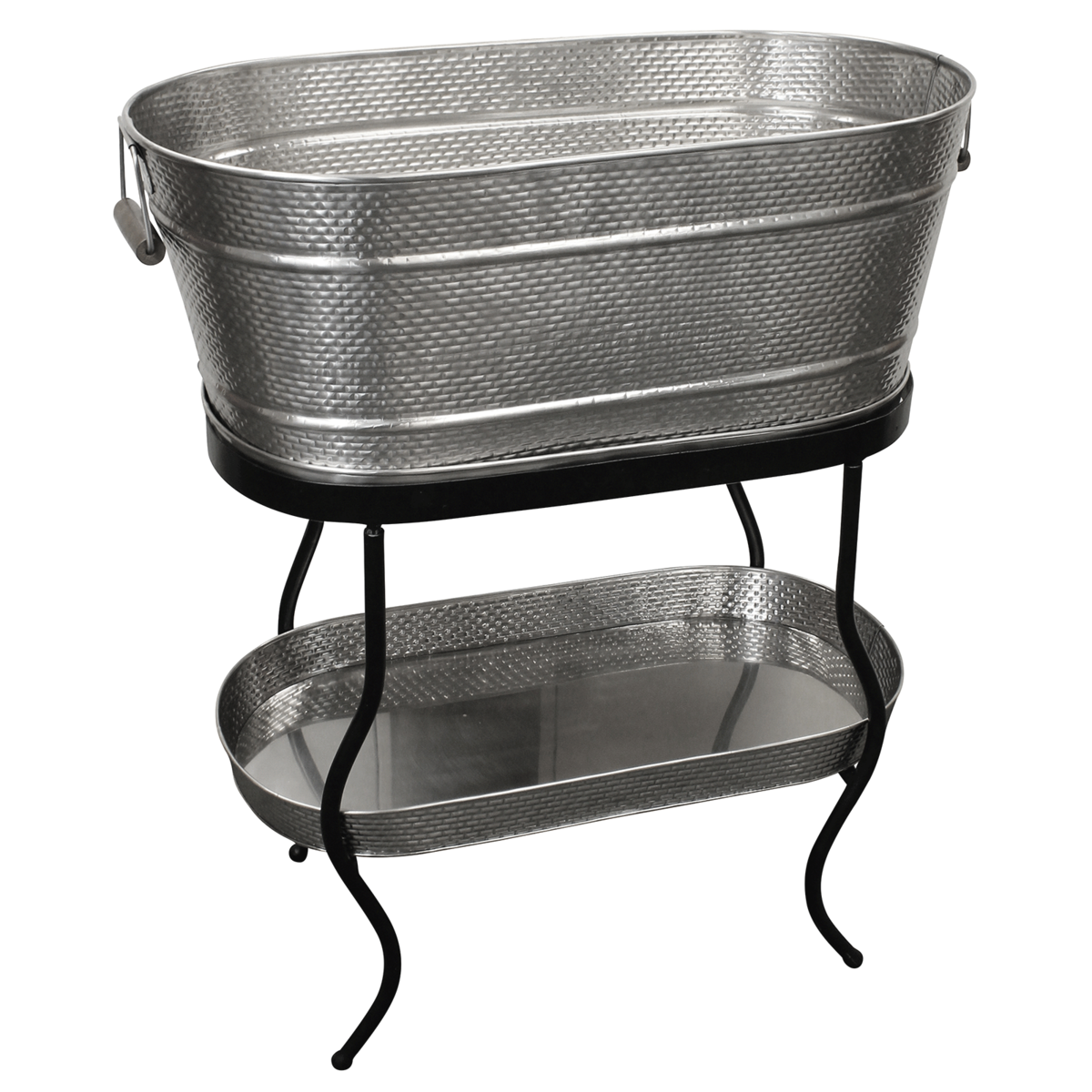 Free--standing 12¾ beverage tub is ideal for high-volume beverage service. Fill with ice, then add water bottles or beer, to soda cans or smoothie cartons. Accessory tray holds glasses, drink accessories & more! Perfect for both indoor and outdoor events. Set includes Tub, Stand, Accessory & Condensation Trays.