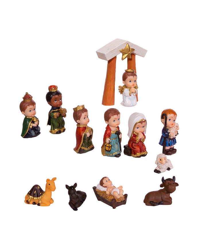 Celebrate the true meaning of Christmas with this 13-piece children's nativity set from Kurt Adler. Its traditional design features Mary, Joseph, Baby Jesus, the Three Wise Men, a shepherd, an angel, a sheep, a camel, a cow, a donkey and an archway.