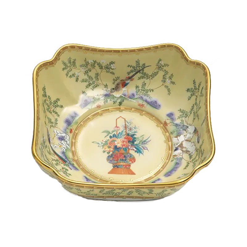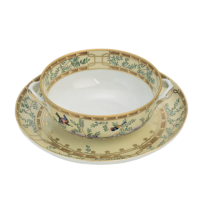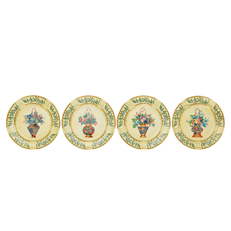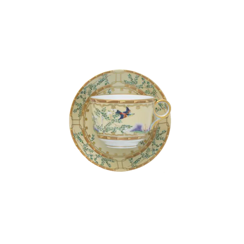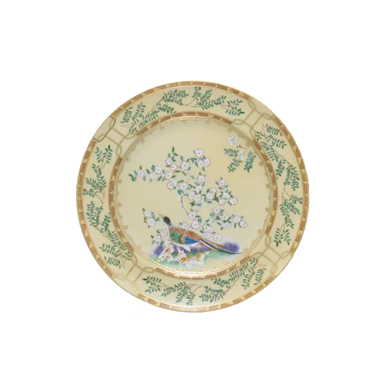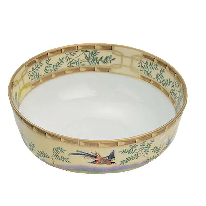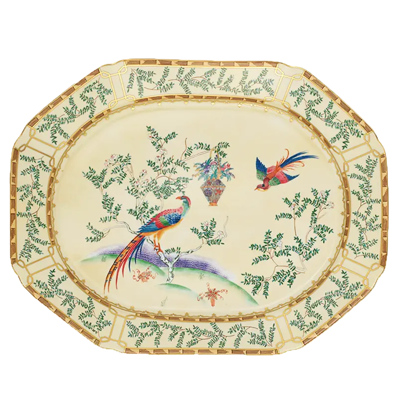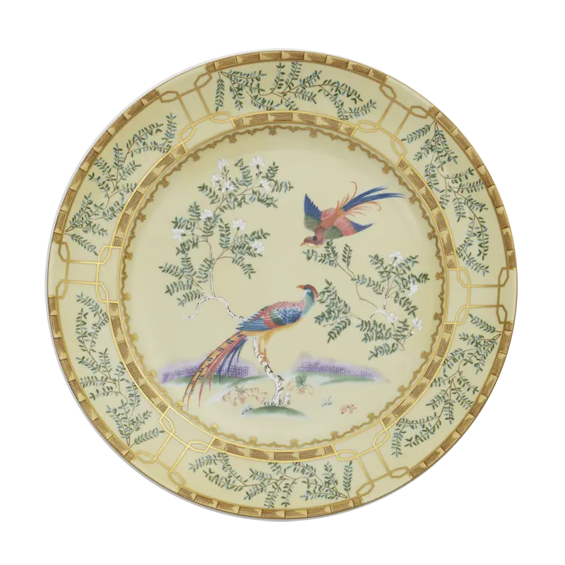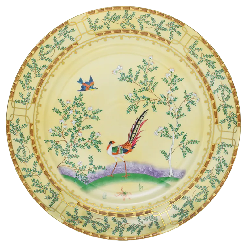 18th century Chinese hand painted wallpaper in the dining room of the Lightfoot House in Colonial Williamsburg was the inspiration for this exquisite pattern. The decoration incorporates blossoming trees, hanging baskets of flowers and exotic birds. Chinese decorative arts, known as Chinoiserie, were popular in the 18th century and continue to be today.