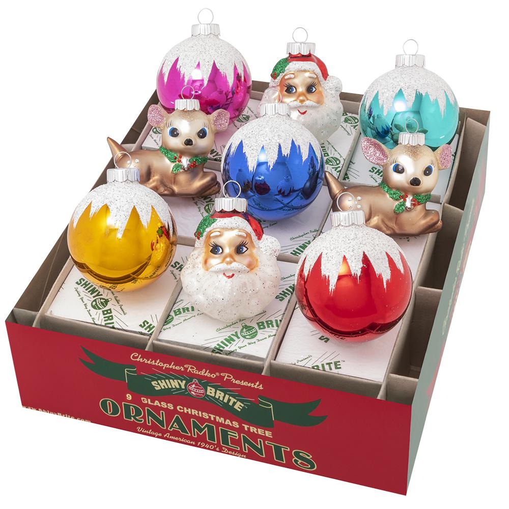 Between the "snow" capped glass rounds, the adorable reindeer and Santa's cheery grin It doesn't get much more charming than this nine-count set!