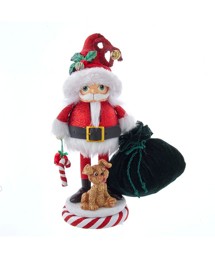 Hollywood Nutcrackers™ is a whimsical collection of nutcrackers created exclusively for Kurt S. Adler, Inc. and features an assortment of designs that put a unique, vibrant, memorable twist on traditional nutcrackers. This 12-inch Chubby Santa With Pup Nutcracker features a Santa in his glittered red and white Santa suit with a decorated Santa hat. He is carrying a green velvet sack in one hand and in the other a miniature candy cane. He is standing on a glittered red and white base with a glittered pup at his feet.