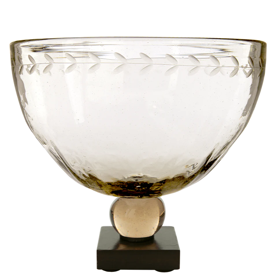 Mouth blown glass bowl with laurel pattern hand engraving on iron stand