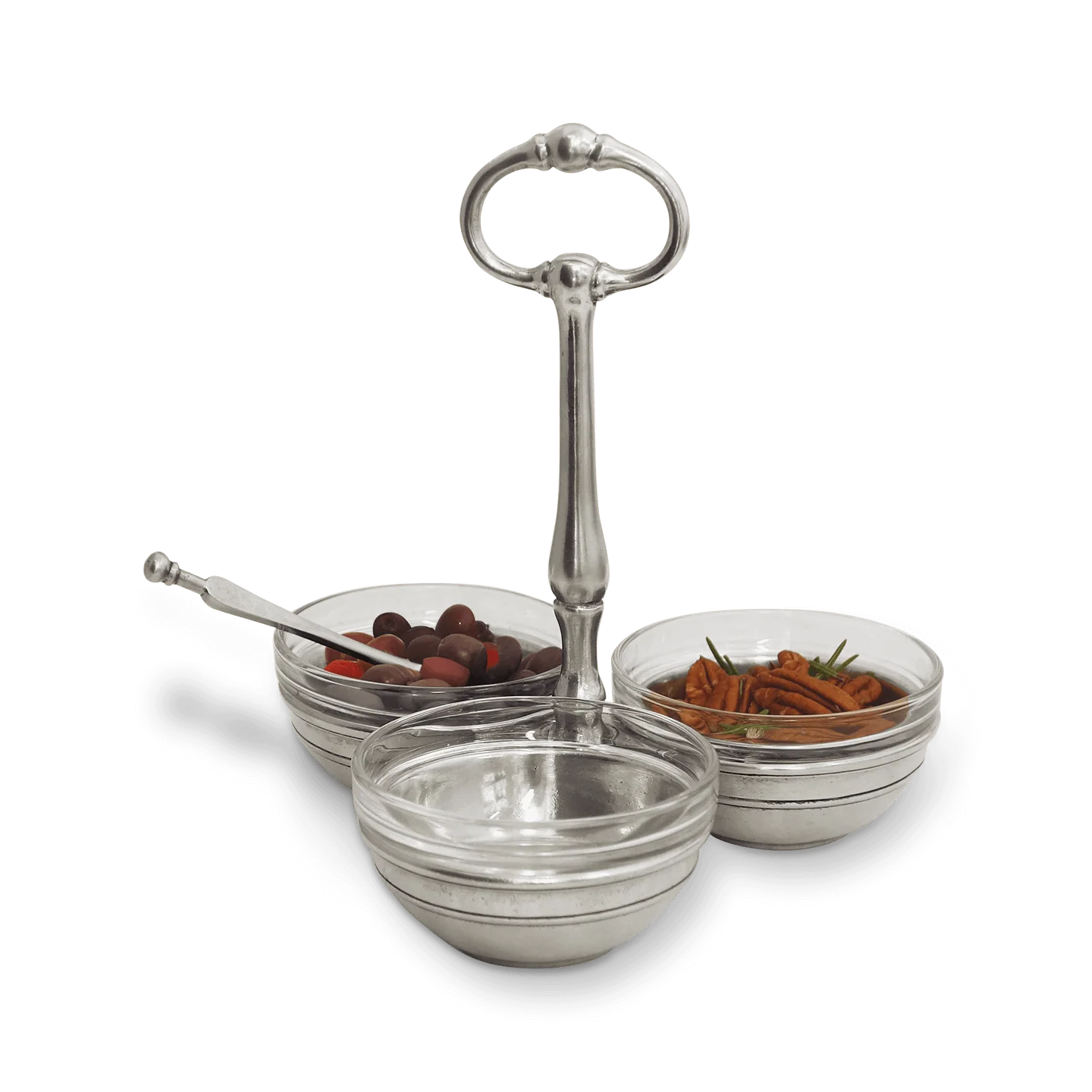 Our condiment trio is an artful blend of glass and pewter. This handled caddy is perfect for sharing sauces, dips, olives, or nuts. The removable glass inserts are dishwasher safe.