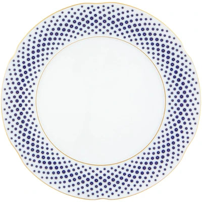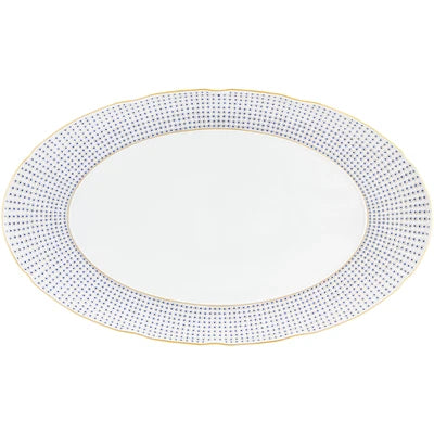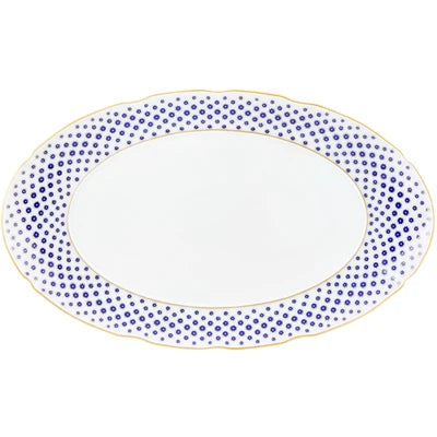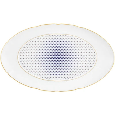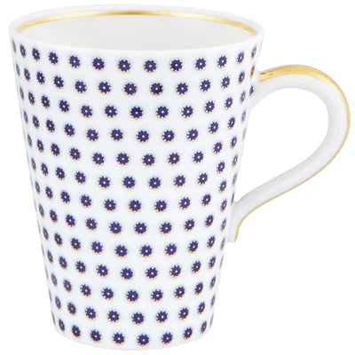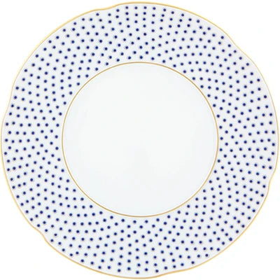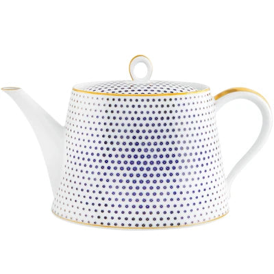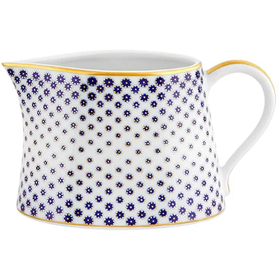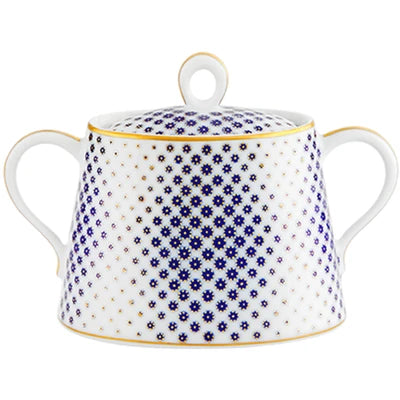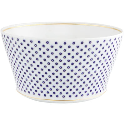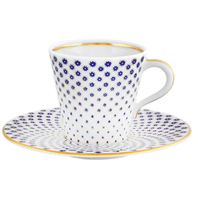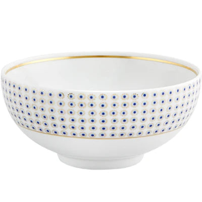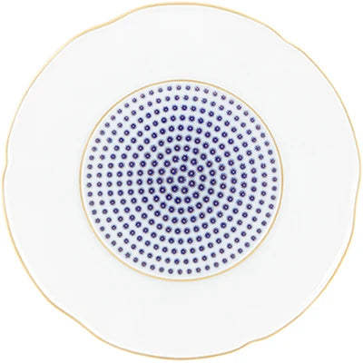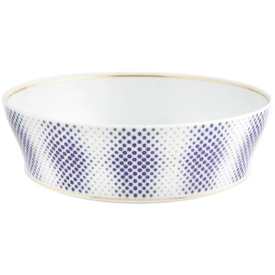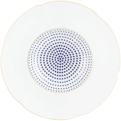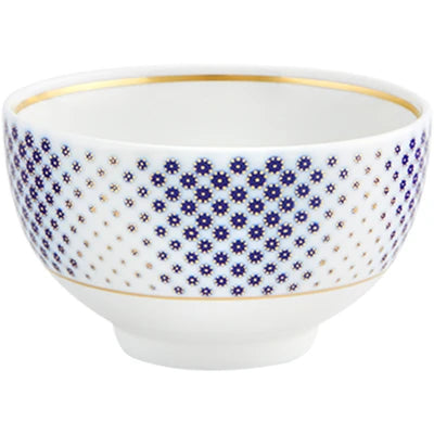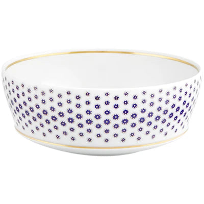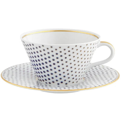 The application of gold in pieces, defining various textures, was used in the porcelain of Sèvres in the late 18th century. Known as “pointillé d’or” or “sablé d’or” (or even “partridge eye”), these motifs mixed golden dots with shades of blue fire, forming small circles. The Constellation d’Or service recreates these geometric patterns and modernizes them, keeping the same decorative technique. On the backdrop of white heavens embossed with gold, the blue-gold constellations’ shines forth.