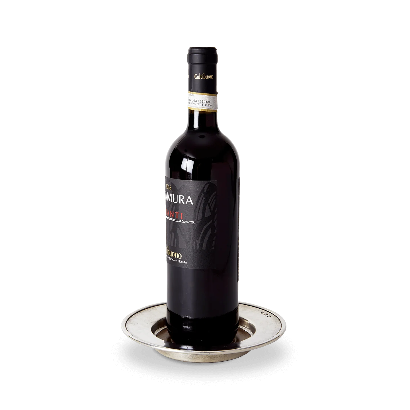 As hard as you try, sometimes you can't help a few droplets of wine running down the side of a bottle. The Convivio pewter bottle coaster, lined with a handsome wood insert, makes a functional and elegant solution to protecting your fine linens and surfaces. It's wonderful as a stylish upgrade for bottled water as well.
