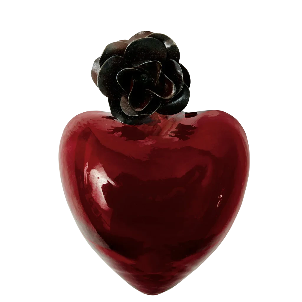 Mouth blown puffed glass heart with a perfectly crafted iron rose