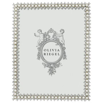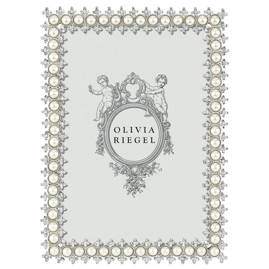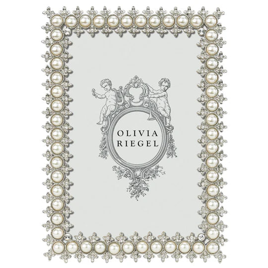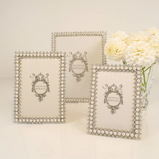 Delicate details with hand-set clear European crystals and faux pearls in silver finished pewter. Elegant gray moiré silk easel back designed for vertical or horizontal placement. Tarnish resistant. Signature luxury gift box included. "Pearls are always appropriate." -Jackie Kennedy