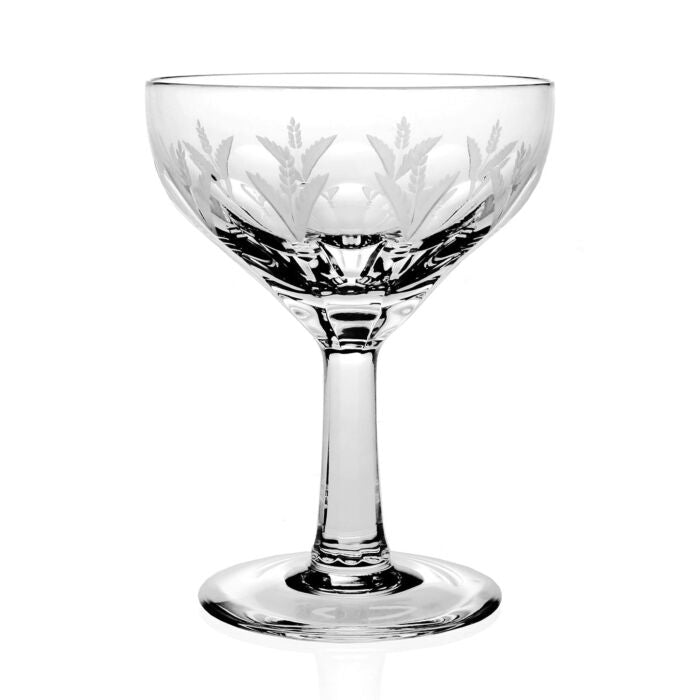 An outstanding range of crystal stemware from Wine Glasses to a charming Champagne Saucer. This beautiful design based on an antique original is delicately hand cut with a small matt motif. A truly stunning and different range of crystal glasses.