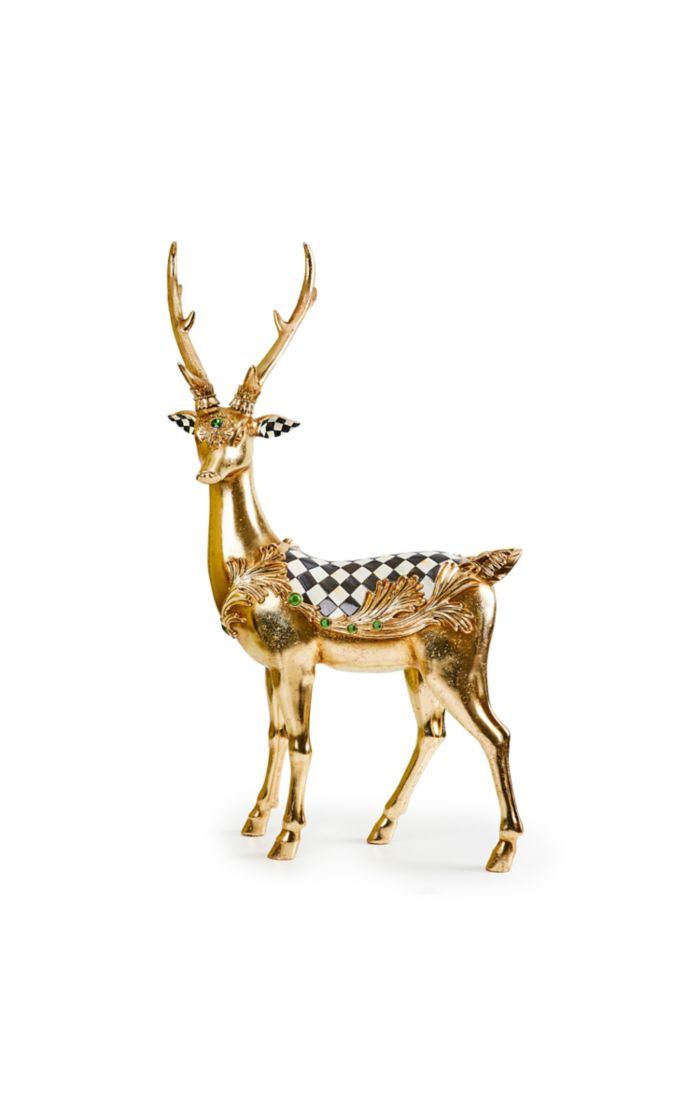 Deck the tabletops with this standing gold leaf deer wearing a Courtly Harlequin blanket that’s finished with emerald green accents.