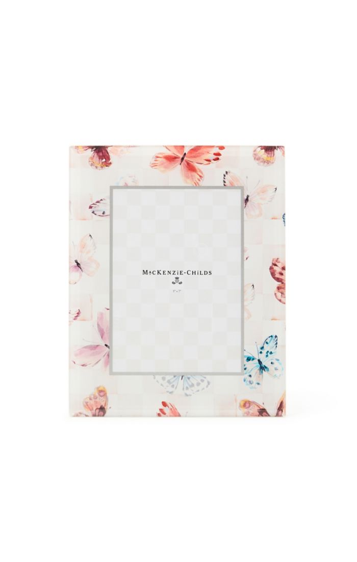 This picture-perfect 5" x 7" frame is a modern addition to your tabletop gallery. It features a pattern of butterflies on Rosy Check® printed on glass.