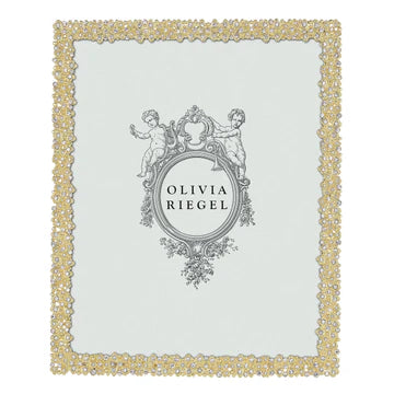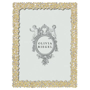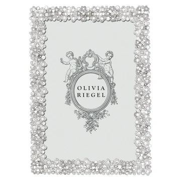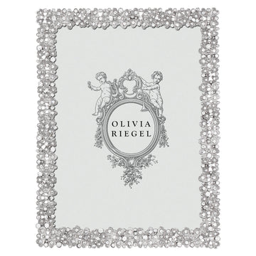 Gold/Silver finished pewter with hand-set clear European crystals. Beveled glass. Elegant champagne moiré silk back, with easel designed for vertical or horizontal placement. Tarnish resistant. Signature luxury gift box included.