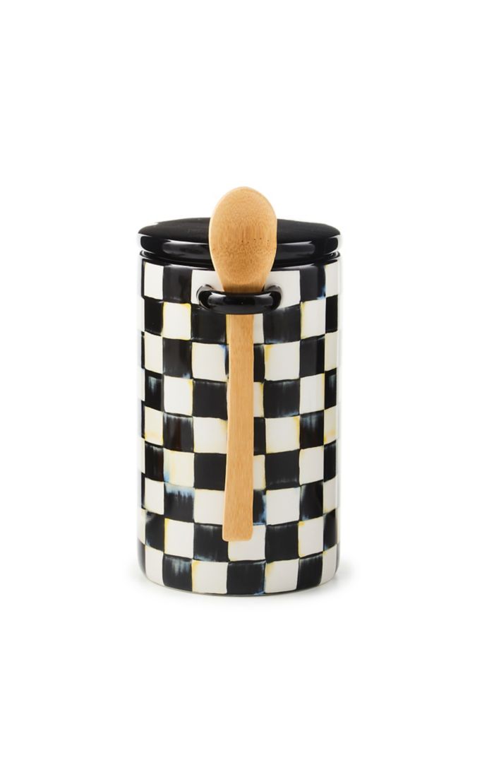Store kitchen staples in the ceramic Courtly Check® Farmhouse Canister. It features hand-applied Courtly Check transfer decoration and has a handy small wooden spoon attached.