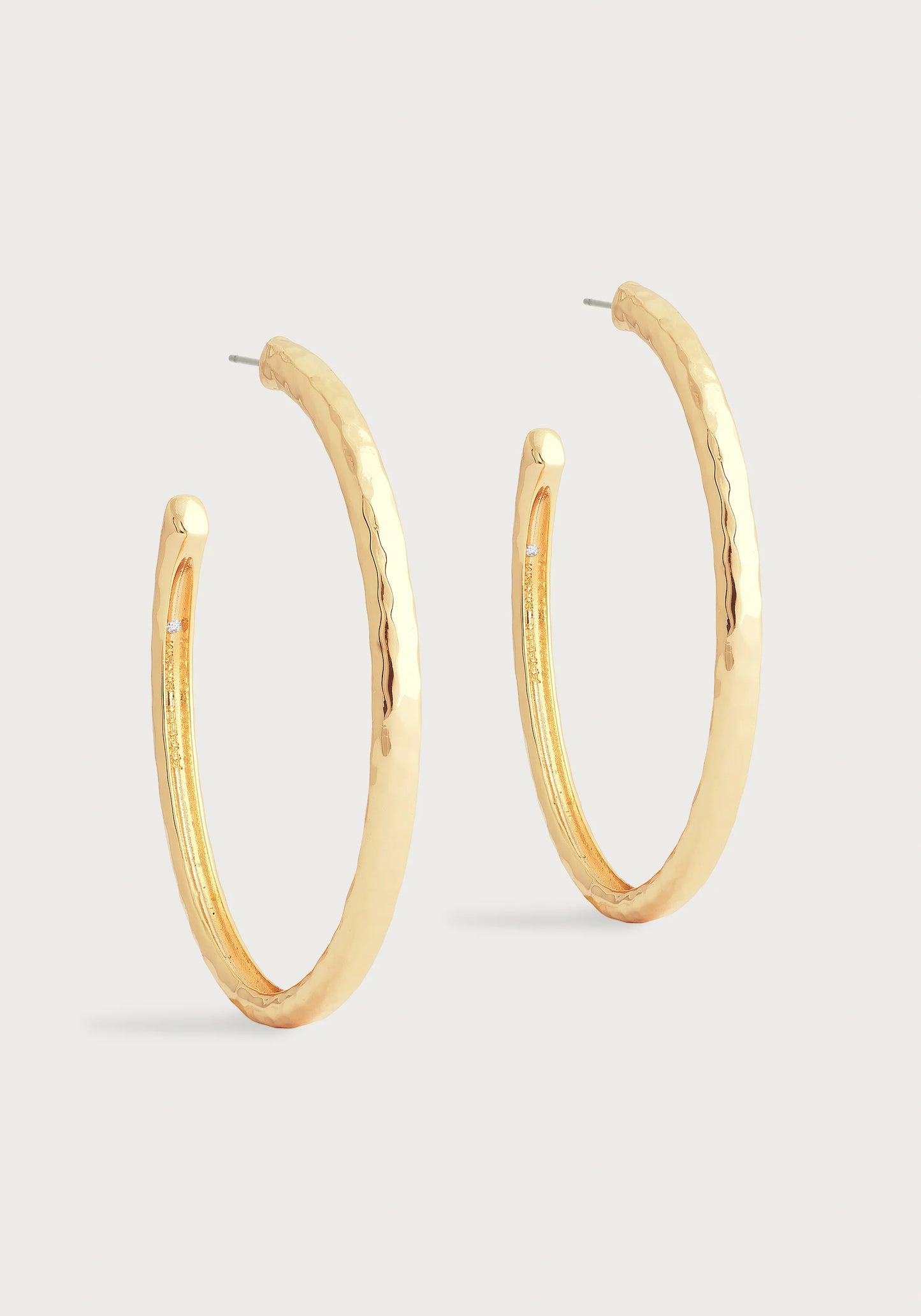 The Farrier Large Hoop Earrings are a striking piece that showcases the perfect balance of craftsmanship and refined sophistication. Crafted from 18k gold plated brass, these large hoops feature a distinctive hammered texture that mirrors the artisanal marks of a blacksmith's hammer, giving the exterior a unique, tactile surface. Designed to make a bold statement, these large hoops are perfect for adding a touch of elegance to any outfit, whether for everyday wear or special occasions.