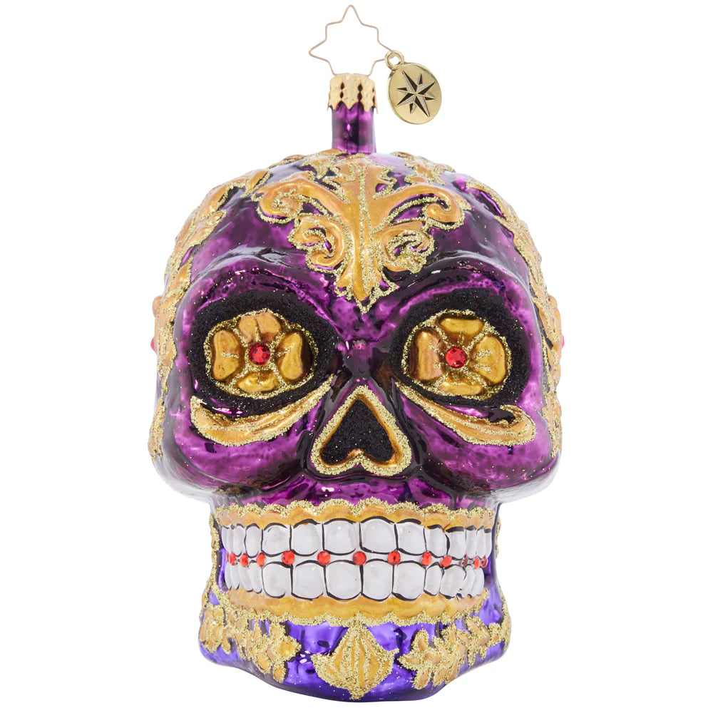 Looking fancy as ever with glowing golden eyes and stunning glittered swirls, this Calavera ornament is a frightfully festive piece to feature on your tree.