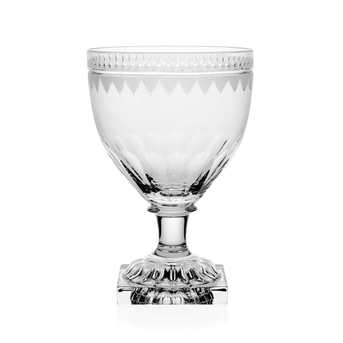 The original Flavia was made in England in about 1790 and has what is called a ’lemon squeezer foot’. These were not made after about 1850 and this shape is much sought after by collectors. The intricate design around the rim is completely hand engraved, with each cut individually applied with an engraving wheel. It takes many hours of highly skilled work to complete one glass.