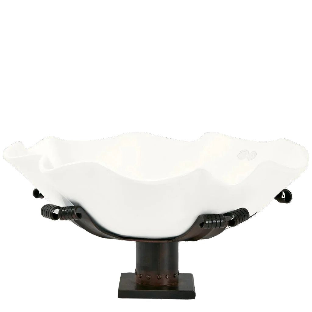 Branded, sealed creamy white ceramic bowl in full bloom, resting atop a forged iron base