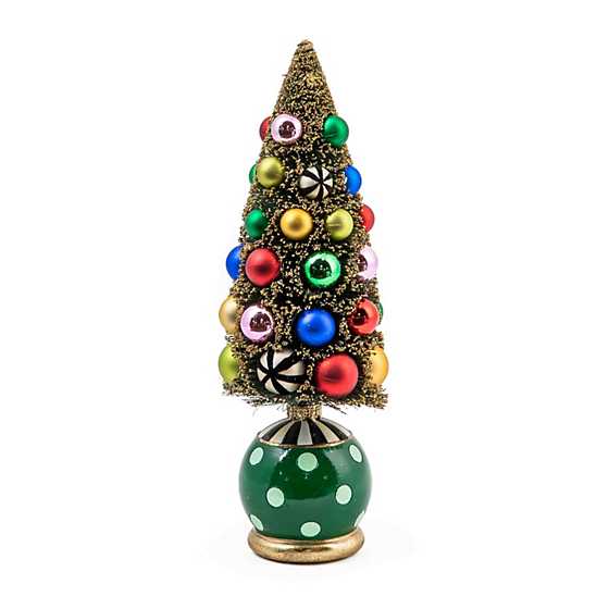 Deck the tabletops or the mantel with this nostalgic small bottle brush tree decorated with small shatter-resistant ornaments, accented with gold glitter, and set in a base of green with dots and Courtly Stripe.
