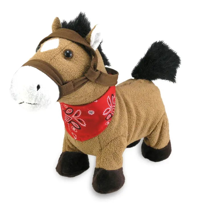 Wearing a red bandana, 8" brown horse Gallop trots and shakes its head and tail to "Giddy Up, Lil' Cowboy!"