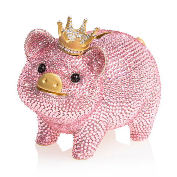 Making the everyday extraordinary! 4,800 Swarovski® crystals ensure the Gatsby Pavé Piggy Bank is a twinkling show stopper no matter where he rest in your home. The entire pale pink enameled piggy bank shimmers with hand-set light rose crystals topped with a gold and crystal crown. First sculpted in clay to capture the sweet pose and then molded in metal finished in 14K gold. Underneath a hidden closure allows all the pennies to be removed!