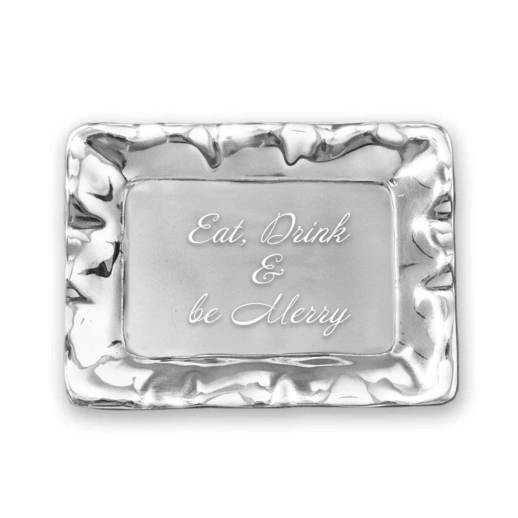 Words to live by... Share your commitment to the good life with this delightful GIFTABLES Vento Rectangular Engraved Tray from Beatriz Ball. Engraved with the slogan, "Eat, Drink and Be Merry," this delightful mini tray is distinguished by its rich, hand-finished surface, and practical size. Perfect on the bar or dining table, or on a coffee table as a decorative accent. From our GIFTABLES Collection featuring handmade and artfully designed Beatriz Ball items at irresistible prices. Packaged in a lovely gift box, makes a lovely present for the Holidays, birthdays, anniversaries, and other occasions. Handmade of an FDA safe, easy-care, oven and freezer friendly aluminum alloy. Tarnish-free.