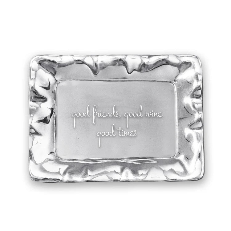 Here's to the good things in life! Demonstrate your priorities with this delightful GIFTABLES Vento Rectangular Engraved Tray from Beatriz Ball. Engraved with the slogan, "good friends, good wine, good times," this handsome mini tray is distinguished by its rich, hand-finished surface, and practical size. Perfect on the bar, or on a coffee table as a decorative accent. From our GIFTABLES Collection featuring handmade and artfully designed Beatriz Ball items at irresistible prices. Packaged in a lovely gift box, makes a lovely present for the Holidays, birthdays, anniversaries, and other occasions. Handmade of an FDA safe, easy-care, oven and freezer friendly aluminum alloy. Tarnish-free.