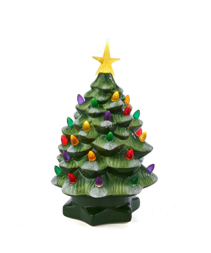 This 10-inch battery-operated green LED tree table piece from Kurt Adler is a fun and festive addition to your holiday décor. This green ceramic Christmas tree is adorned with a gold star, white glitter, and brightly colored LED light bulbs that glow when this piece is switched on.