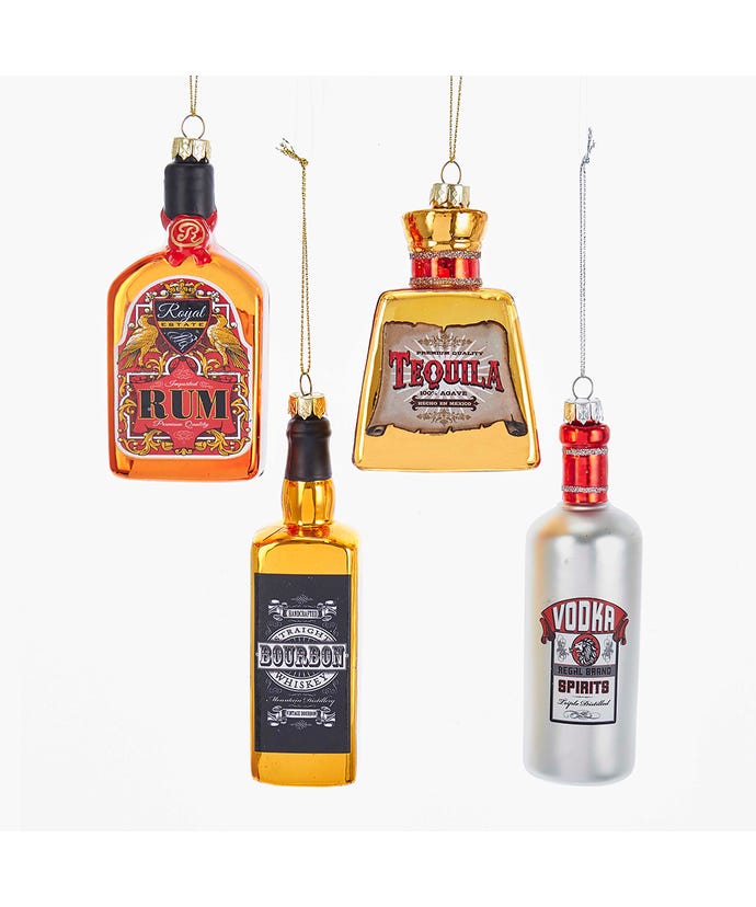 These glass alcoholic bottle ornaments from Kurt Adler are a festive addition to any holiday décor or Christmas tree. This assortment features a bottle of Vodka, Whiskey, Tequila and Rum.