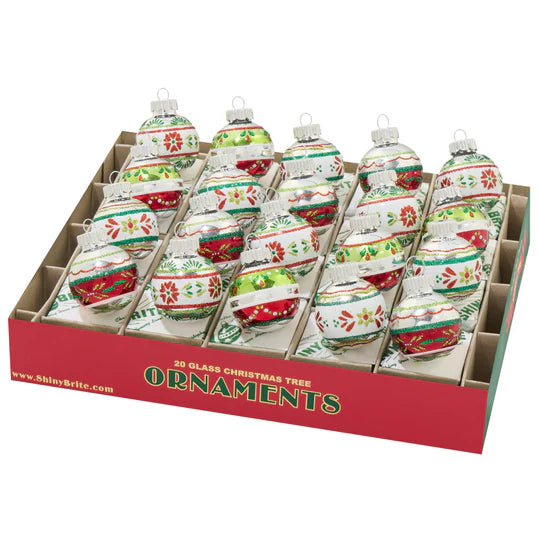 These traditional glass ornaments feature classic red, green and white colors, with intricate designs. Perfect for adding a touch of vintage charm to your Christmas tree.
