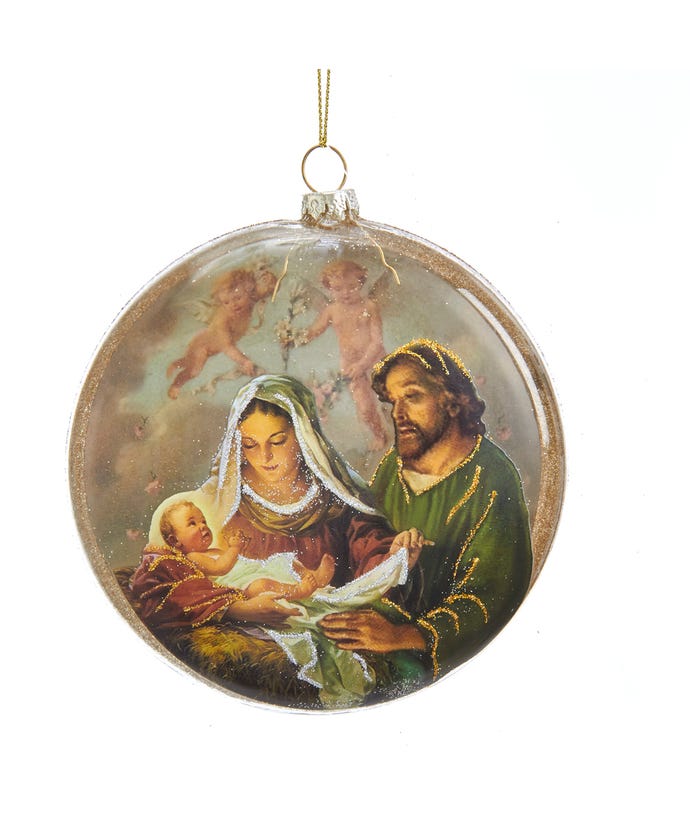 Celebrate the true meaning of the season with Kurt Adler's glass holy family disc ornament. This ornament is accented with gold glitter and features the holy family with two cherubs.