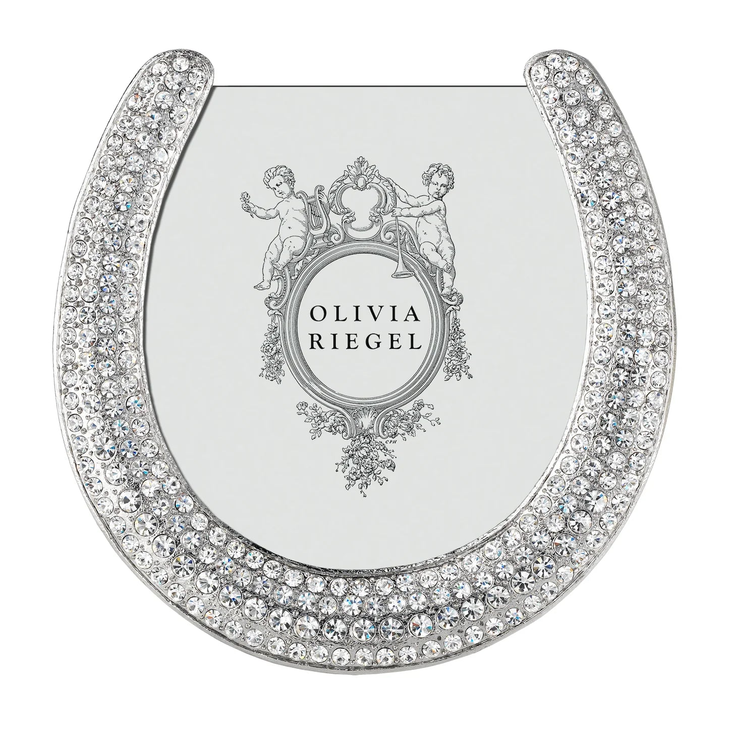 Spread joy and spark luck with a glamorous gold or silver finished pewter horseshoe. Encrusted with hand-set clear pavé European crystals. Moiré silk back. Tarnish resistant. Signature luxury gift box included.