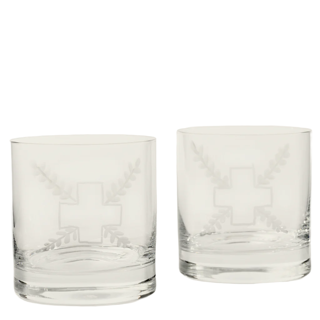Set of 2 double old fashioned glasses with regal hand engraved cross & laurel