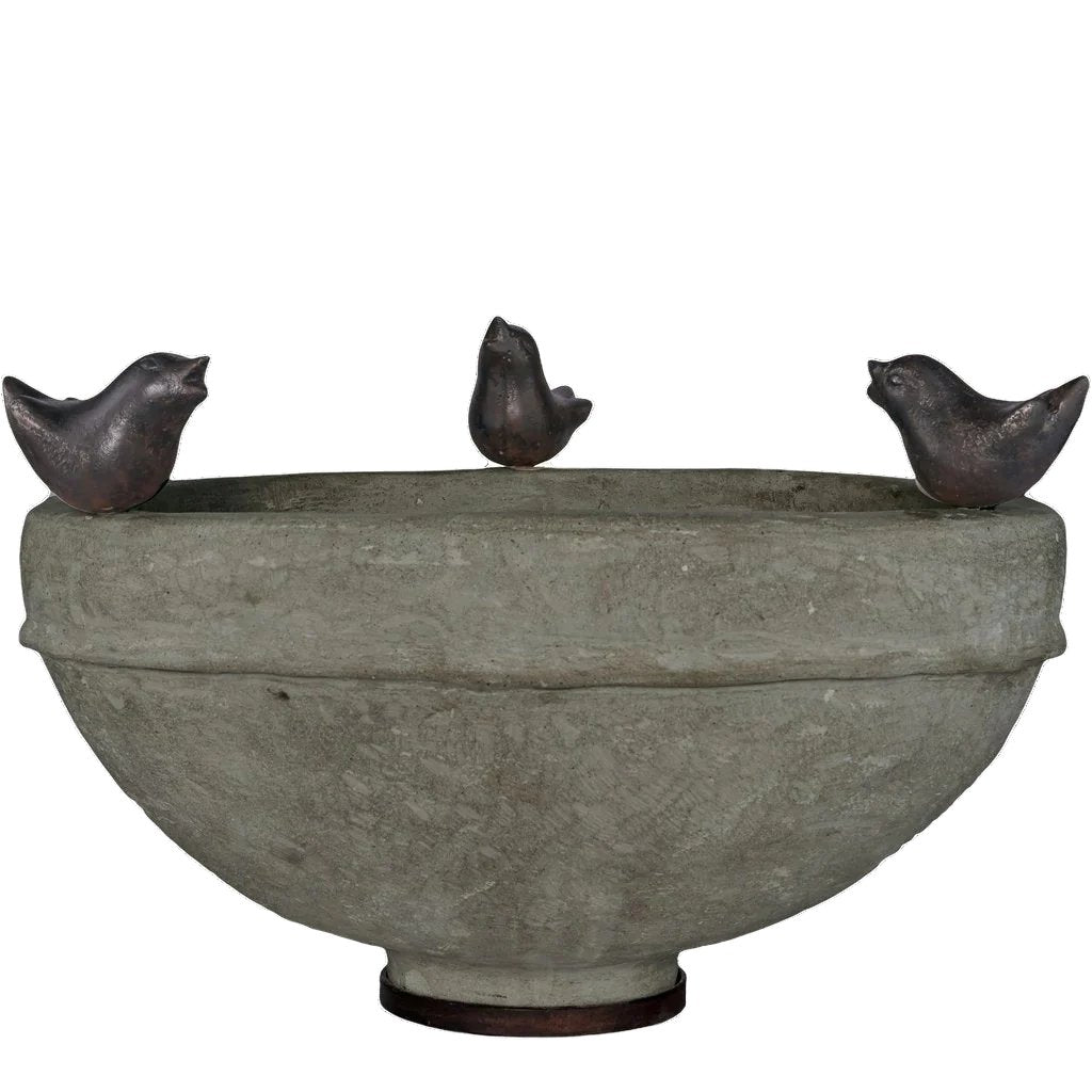 Cast cement bowl with 3 wax cast iron birds with iron base
