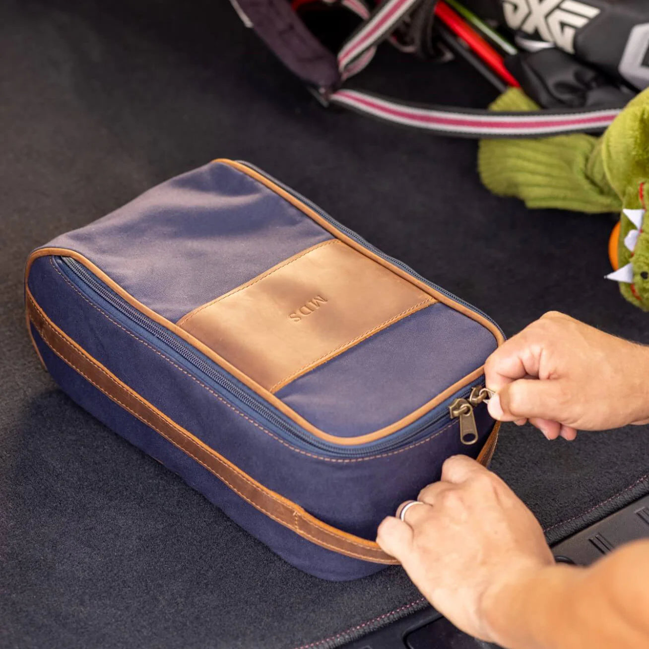 Stay organized and elevate your golfing experience with our golf Shoe Bag. A convenient and classy way to get your shoes from point A to point B. The Golf Shoe Bag features the classic JH Cotton Canvas with oiled leather detailing along with a divided insert . Place into your gym bag or luggage, ensuring your shoes are kept separate from other belongings, or carry it separately with its all-leather top handle.