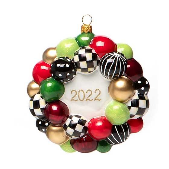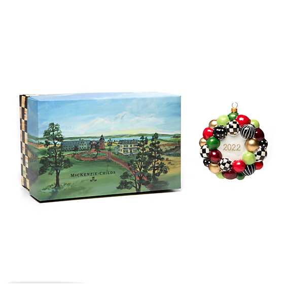 Commit the year to memory with the Jolly Bauble Dated Wreath Glass Ornament. Colorful and charming, this is a wreath of red and green baubles with the year 2022 in the middle. Finely crafted, handcrafted, mouth-blown, and hand-painted in Eastern Europe by some of the worlds most talented glass artisans. Includes a MacKenzie-Childs brass logo charm and keepsake gift/storage box.