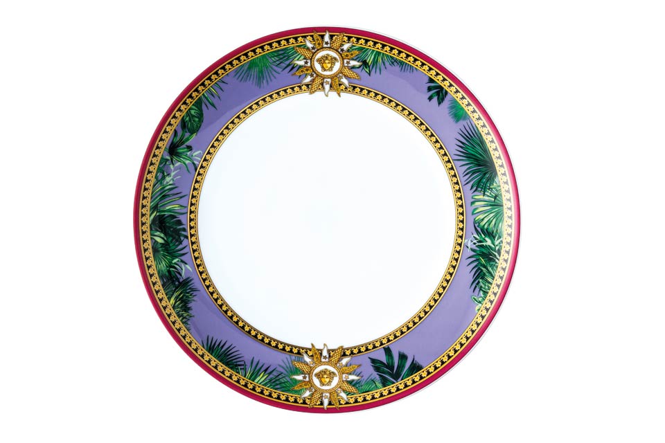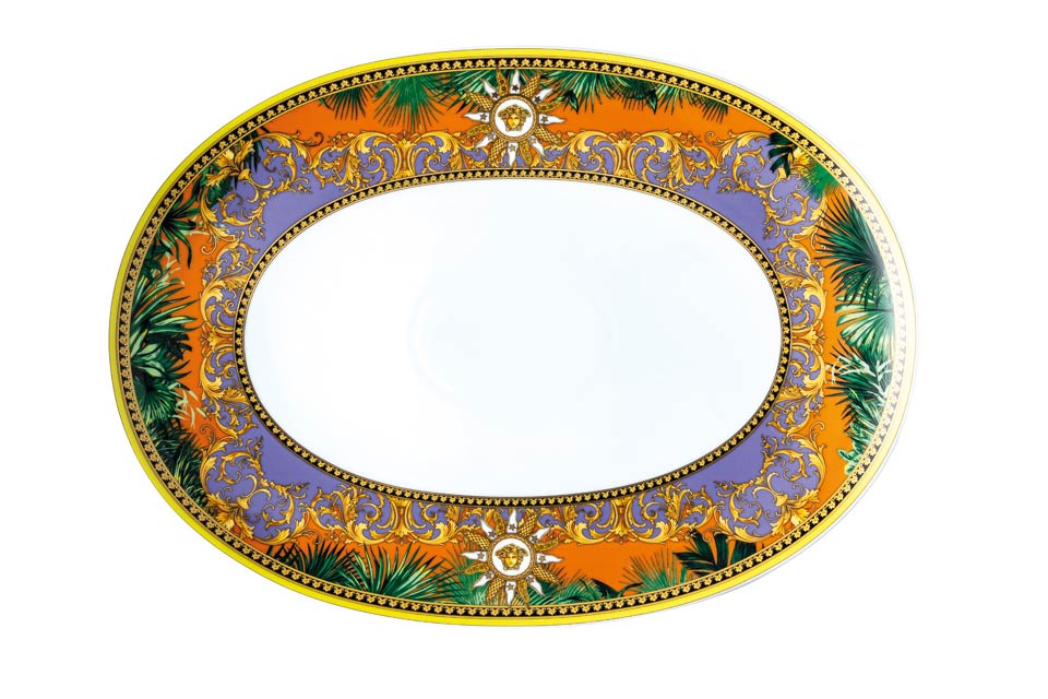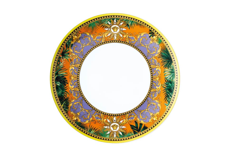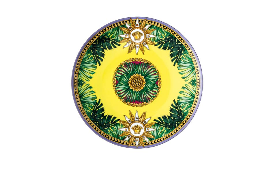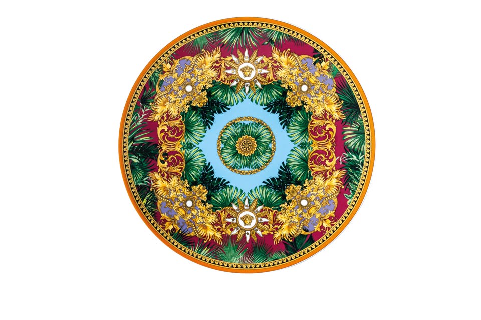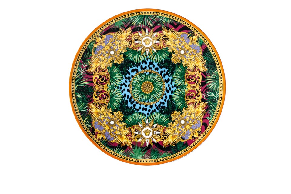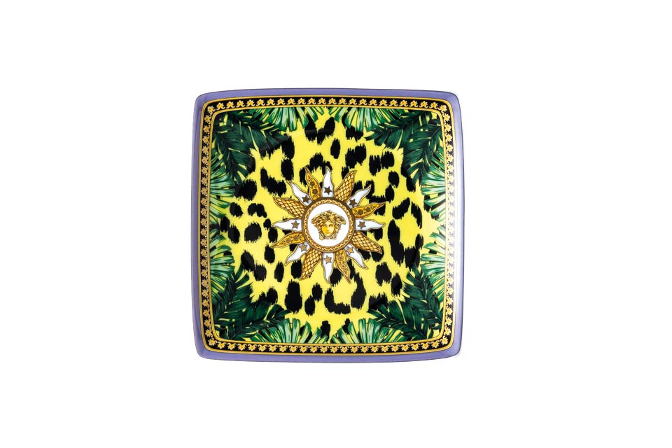The iconic Jungle print elements fused with heritage Barocco motifs and gold-tone Medusa accents. The bold design draws inspiration from the legendary print famously reprised on the Versace Spring-Summer 2020 runway and the book “South Beach Stories”, an iconic photographic book by the Versace family.