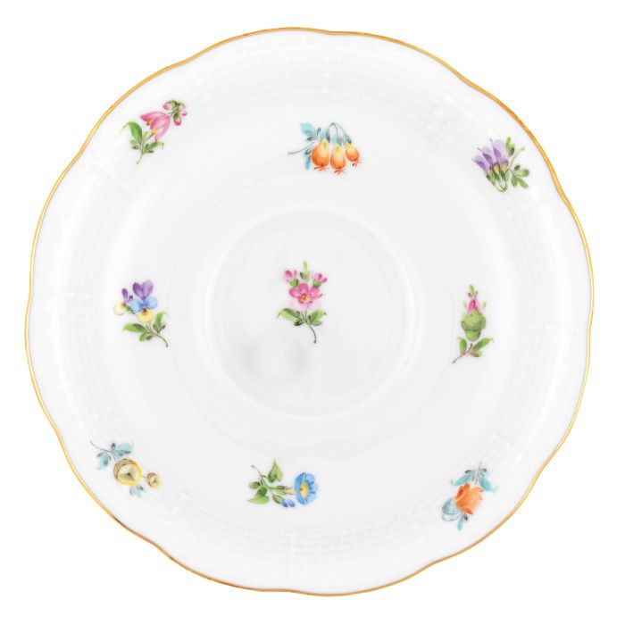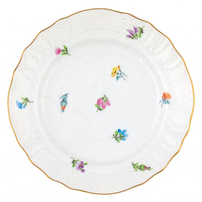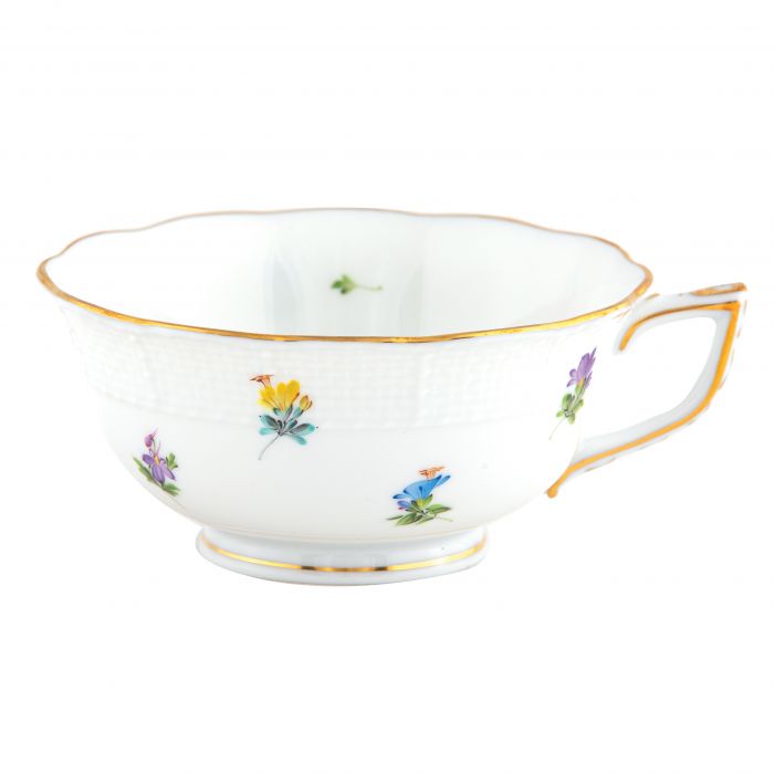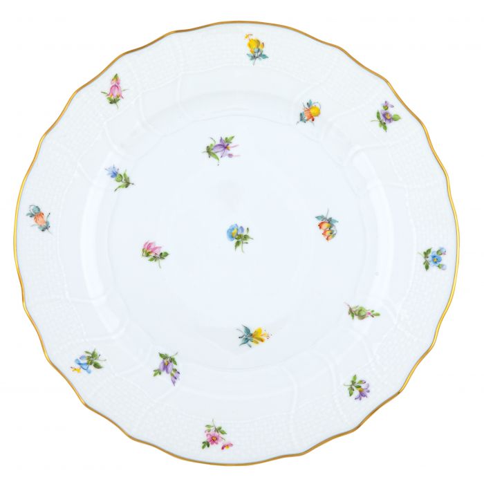 A showcase of remarkable floral paintings in miniature, this "milles fleurs" pattern features painstakingly petite blossoms on a pure white field.
