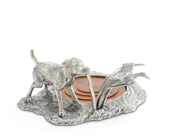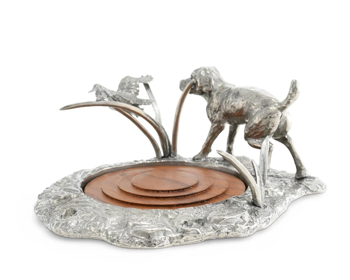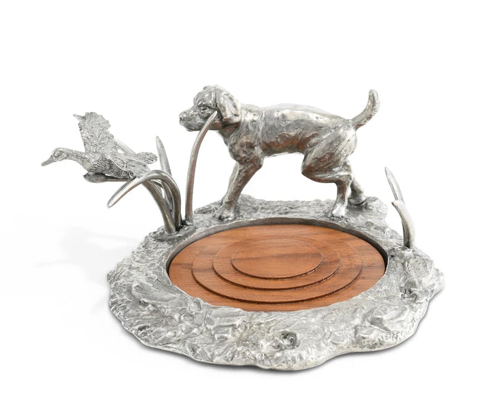 A pure Vagabond House pewter figural still-life of a loyal Labrador flushing a duck near the acacia wood pond, this wine coaster is a perfect marriage of function and form. The intricate detail is the signature style of our designer, Helen Harris Richard. Size: 5"W x 6.5" H Care: Hand wash and dry. Wood insert not Recommended for dishwasher