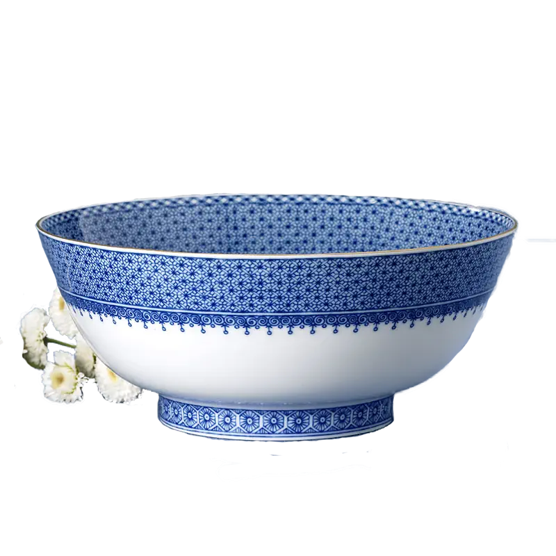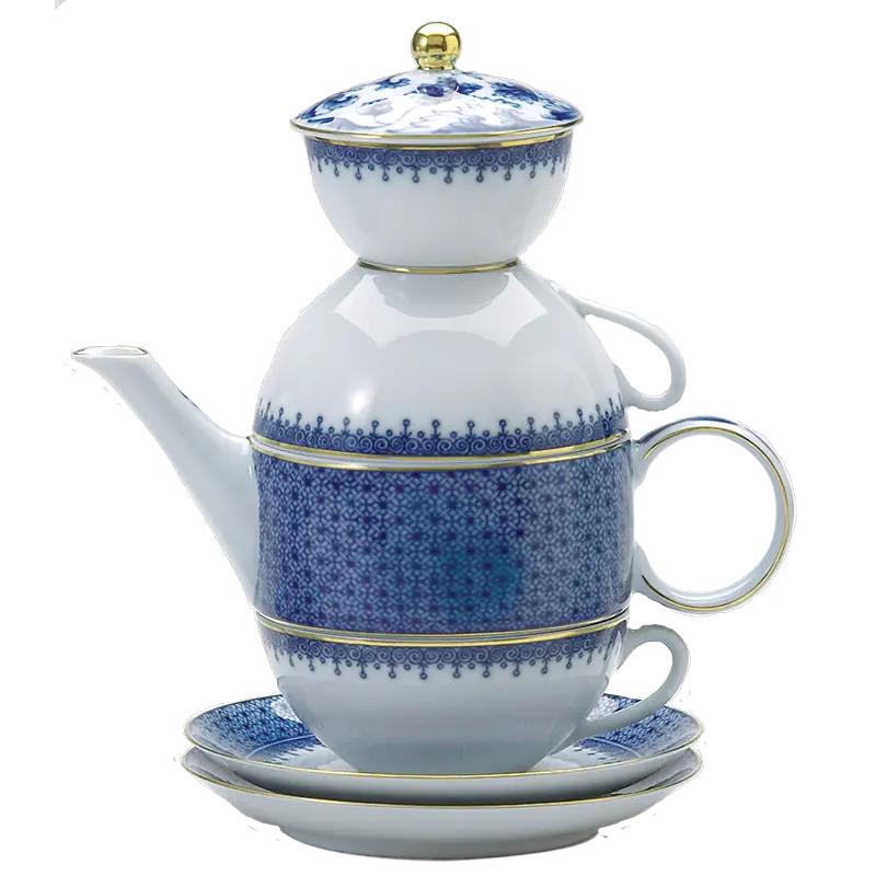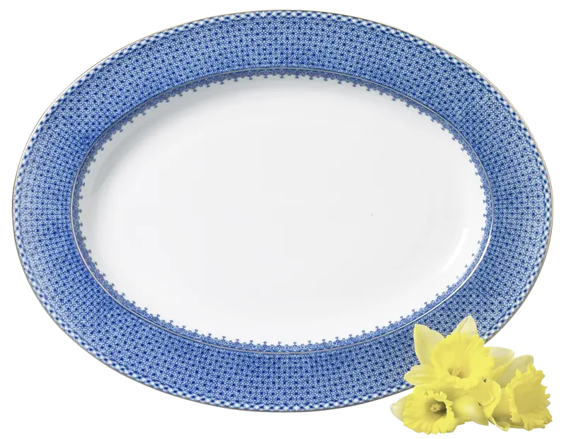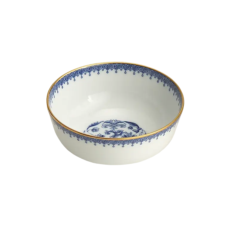 Porcelains of the Chi’ing Dynasty (1644-1911) were the inspiration for this versatile pattern with its delicate teardrop border and rich high fire blue color. Highlighted by bands of 22k gold, this elegant design offers both the feel of elaborate decorative detail while also being perceived as a solid design. It coordinates beautifully with other services.