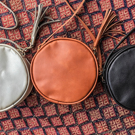 This trendy leather crossbody bag is perfect for any girl on the go! The zipper features a super fun tassel and this bag also comes in a clear version for concerts and sporting events, as well as our signature coated canvas version.