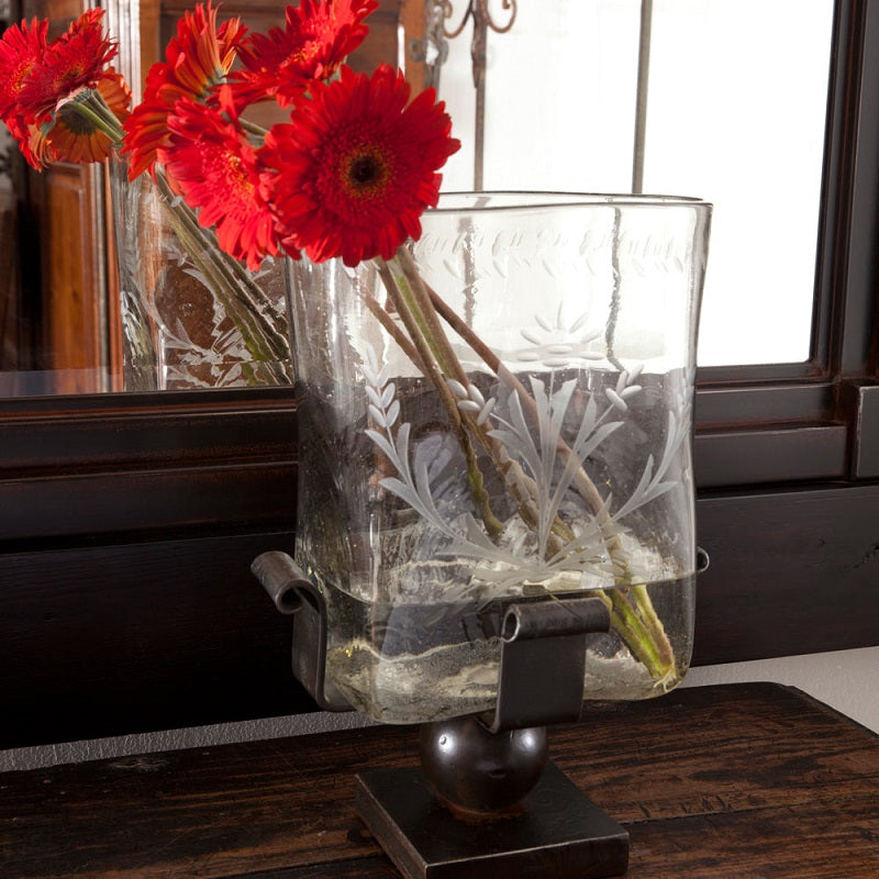 Mouth blown engraved vessel on forged stand... stands alone or beautiful with flowers.