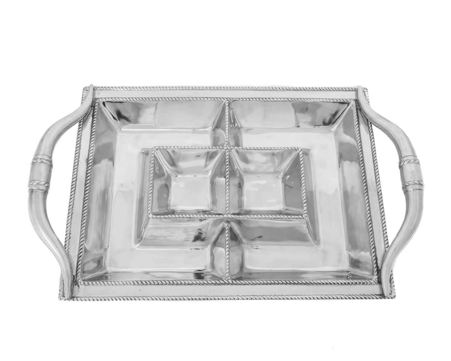A double-sided border extends its ropy pattern into the middle of this dish, covering the edges of the square basins. Horns create sturdy handles on each end of this handmade, aluminum piece as their tips attach to each corner of the tray.