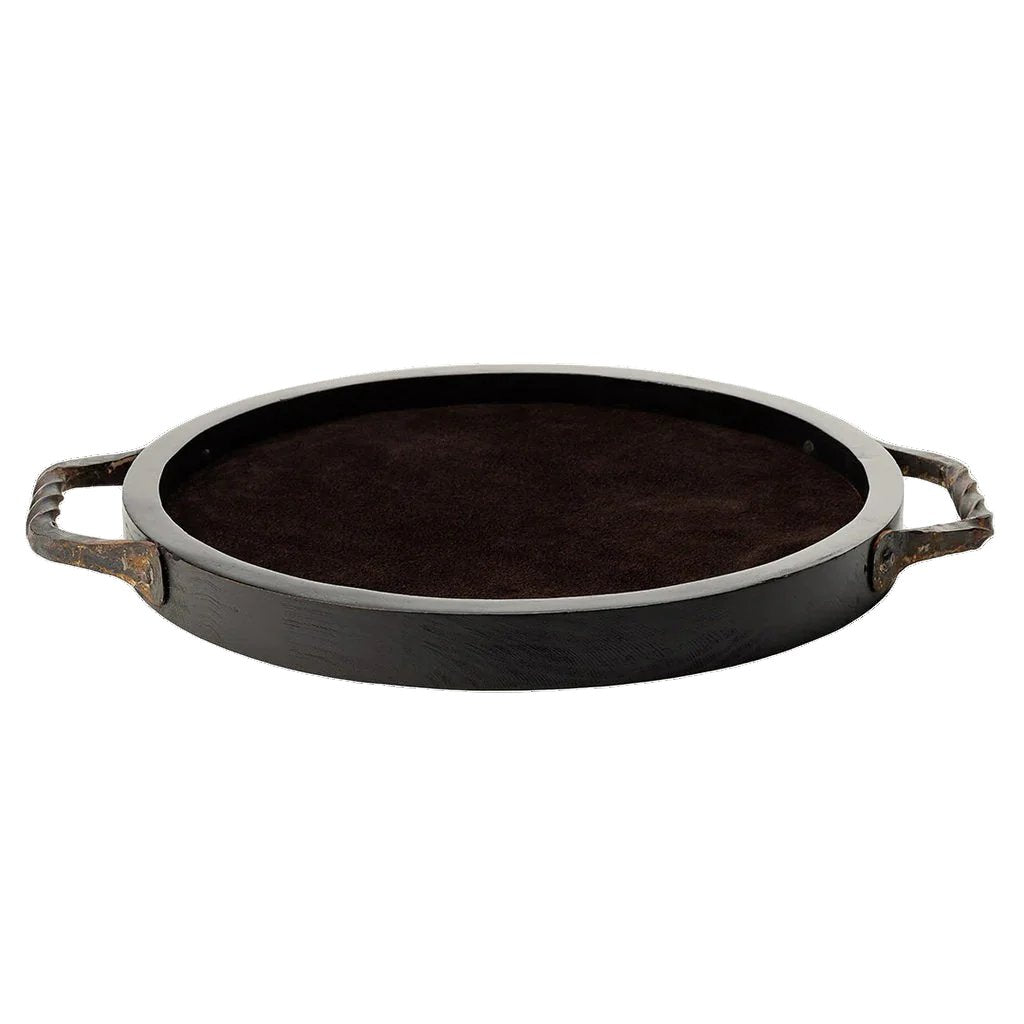Hand wrought iron handles on each side of wooden tray w/ suede liner