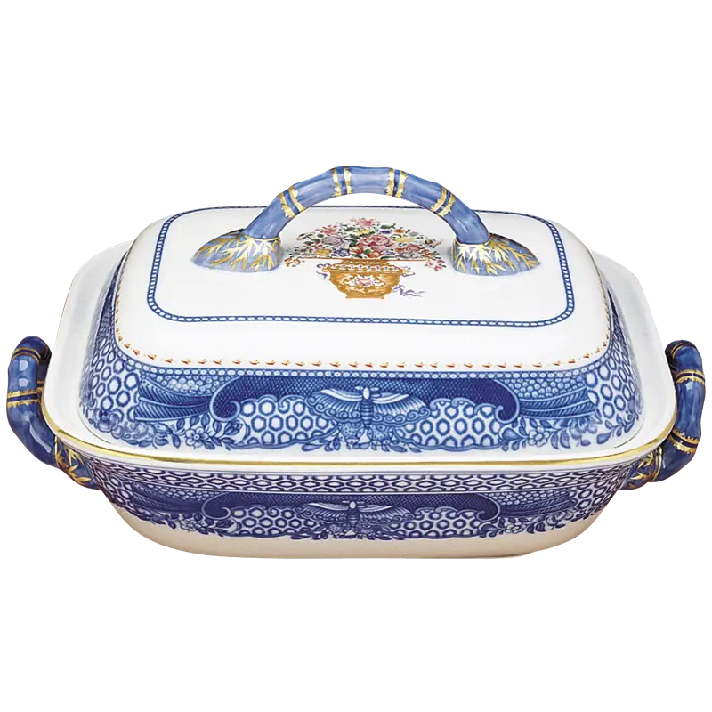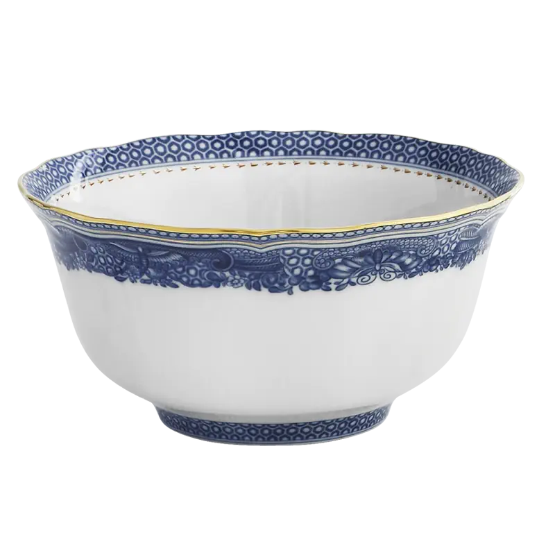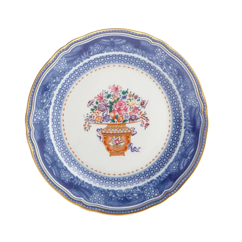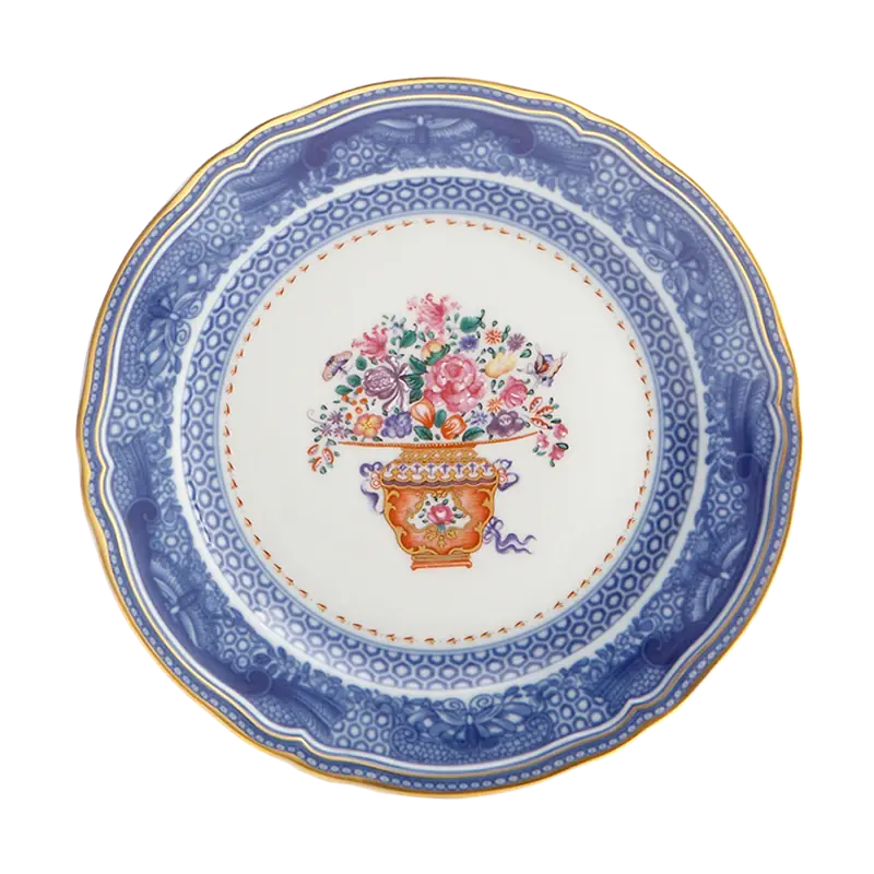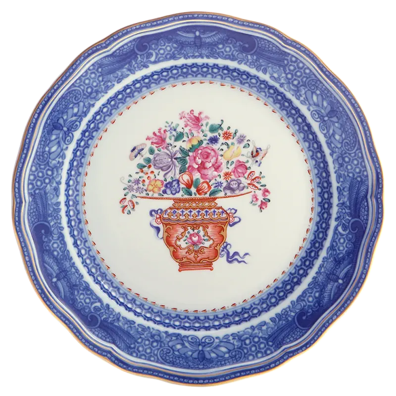 A charming bouquet in a basket, adapted from an 18th century Chinese export Hong bowl, is surrounded by the classic blue and white Fitzhugh border. The elements combine to create an exuberant, shapely, and elegant dinner service. Produced from the collection of Winterthur Museum and Garden.
